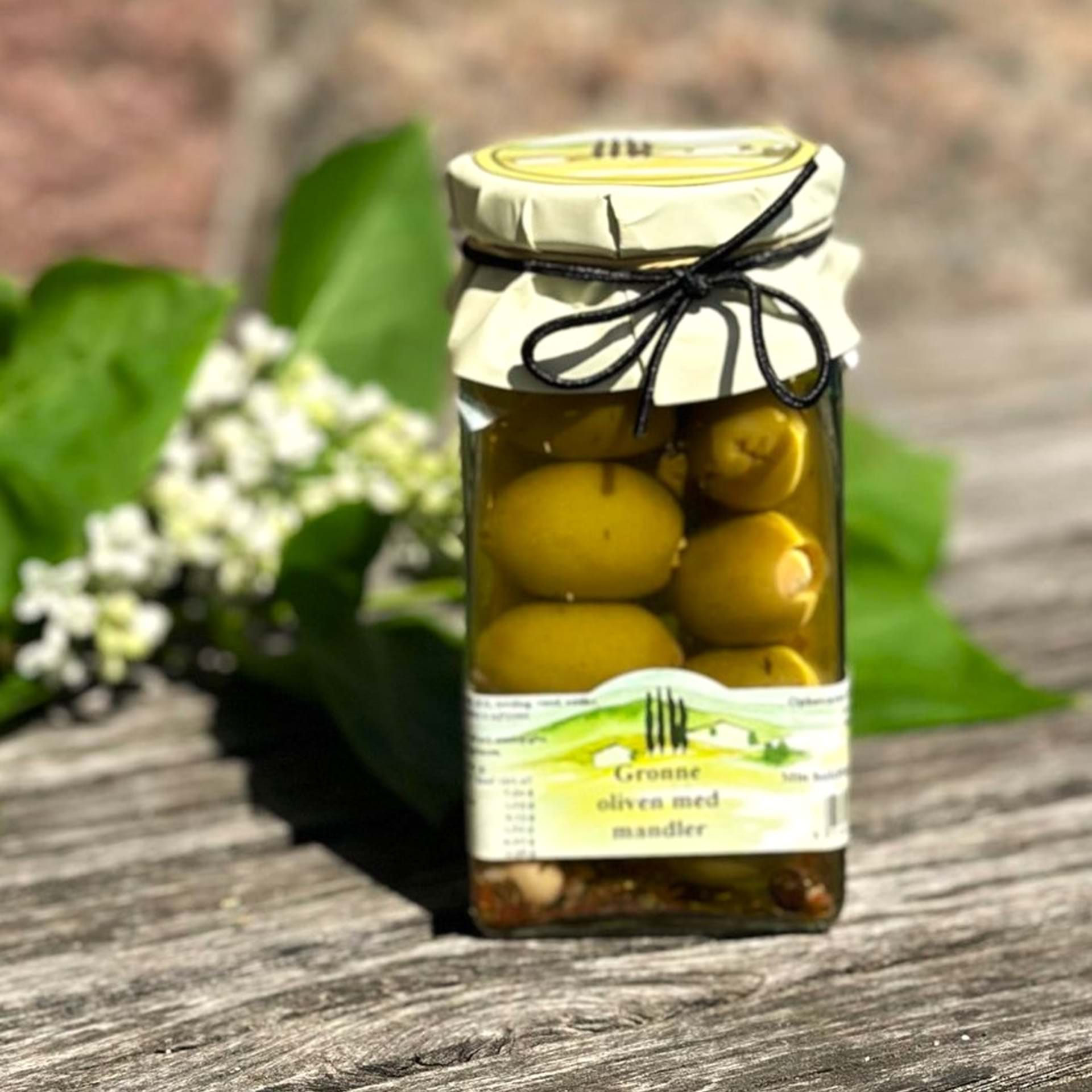 Oliven, MANDLER, hvidløg, vand, eddike, sukker, salt, urter.