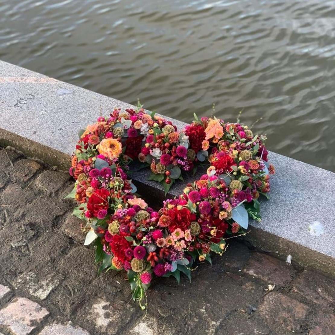 Et flot åbent hjerte i årstidens blomster. En pyntelig og symbolsk afskedsgave, til en du holder kært.