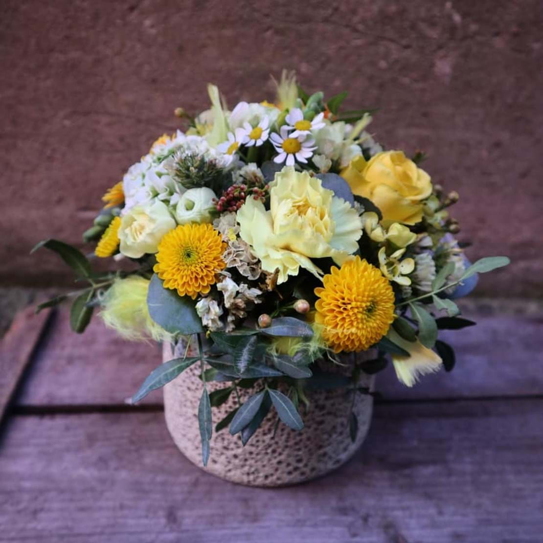 Lækre afskårne blomster i årstidens farver, som dekoration, hvor modtager bagefter kan beholde en flot skjuler, der tilpasses blomstervalget. Der kan forekomme variationer i det afskårne ift. billedet, samt skjuleren.