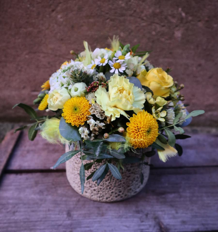 Lækre afskårne blomster i årstidens farver, som dekoration, hvor modtager bagefter kan beholde en flot skjuler, der tilpasses blomstervalget. Der kan forekomme variationer i det afskårne ift. billedet, samt skjuleren.