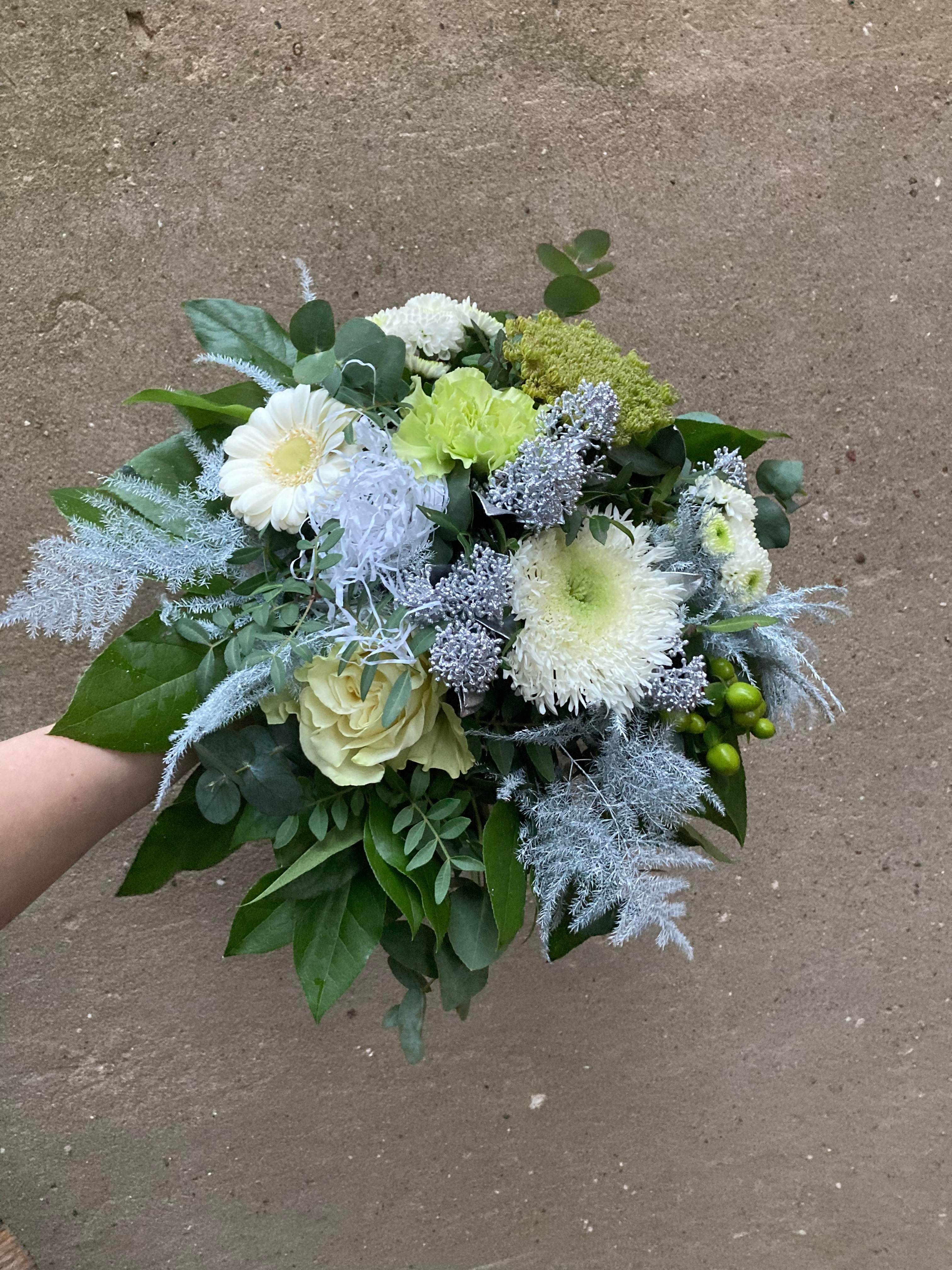Buketten bindes lav og tæt, og kan have små afvigelser fra billedet ift. materialevalg.
