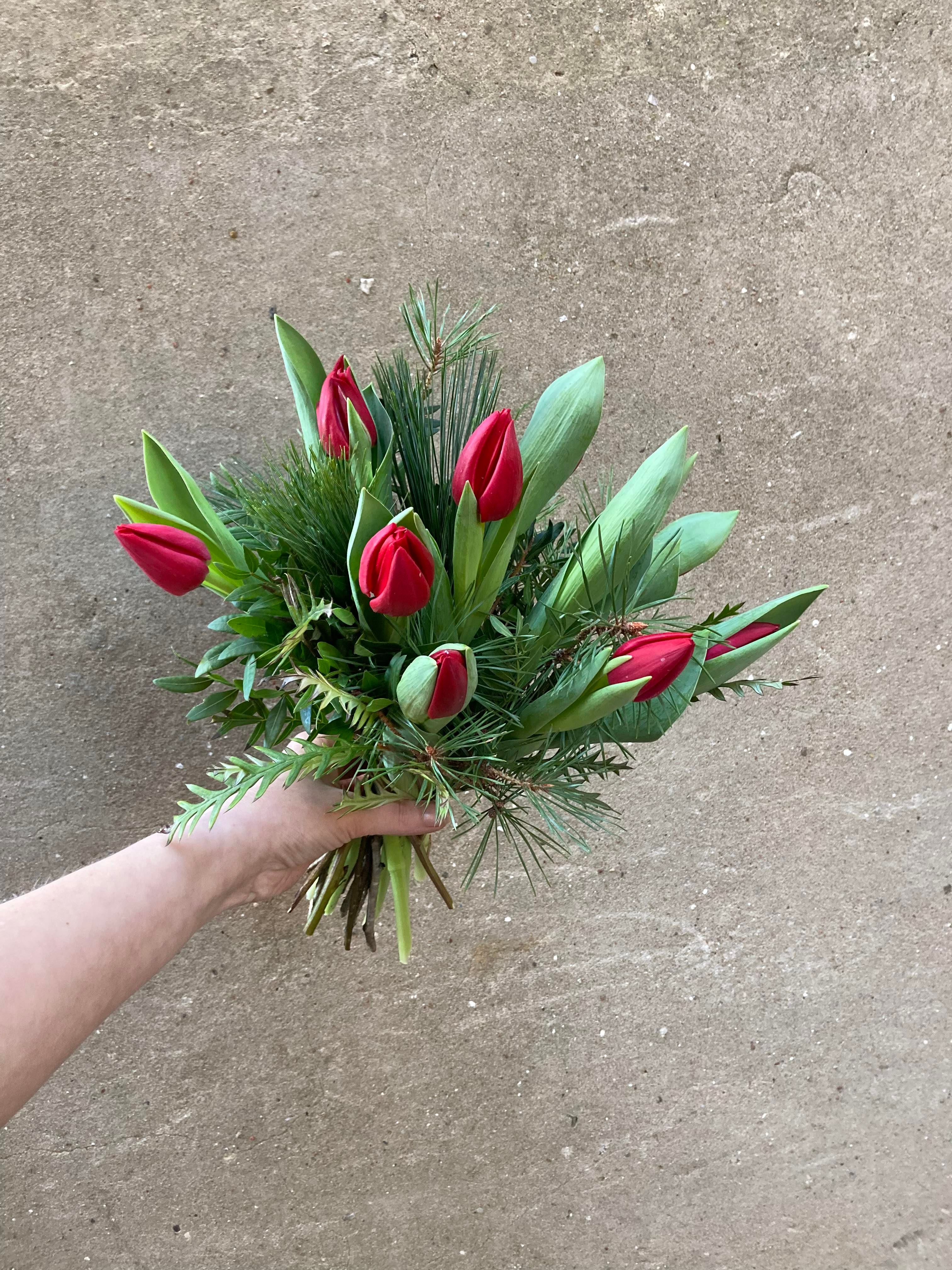 Smuk buket af julerøde tulipaner med blandet vintergrønt. En flot buket til både dig selv eller en du holder af.