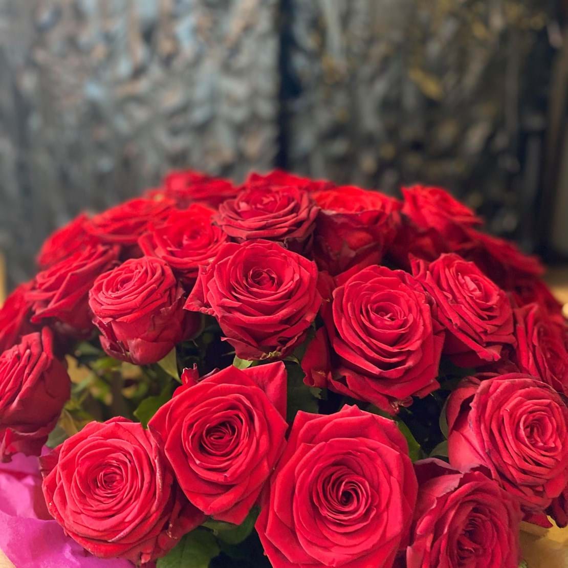 En høj buket roser med grønt. Antallet af roser kan variere afhængig af årstiden og farvevalg.