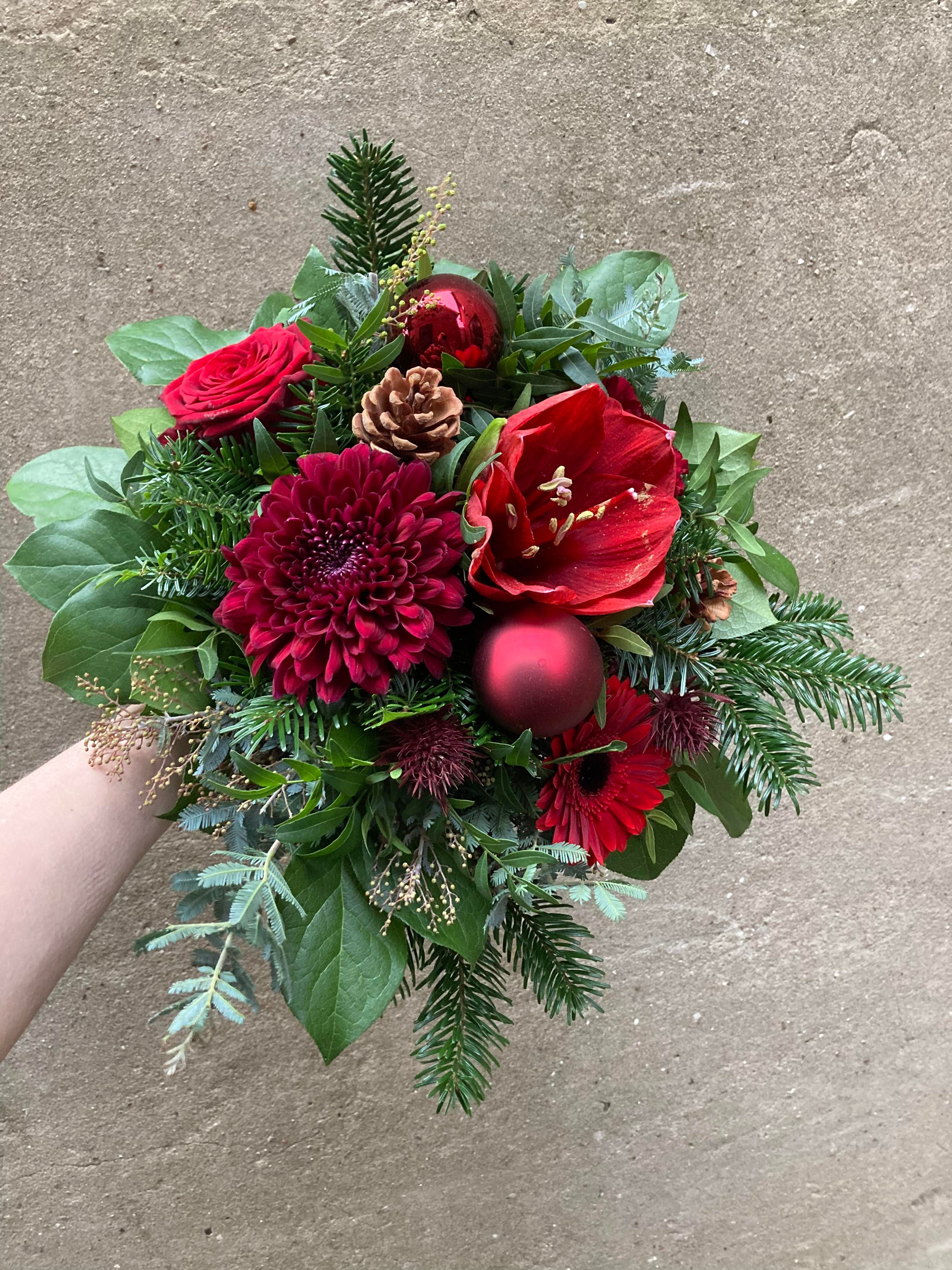 En smuk julebuket i røde farver. Den vil pryde smukt på ethvert julebord og bringe stemningen af denne højtid ind i hjemmet. En smuk vært eller værtindegave, eller til ren selvforkælelse.