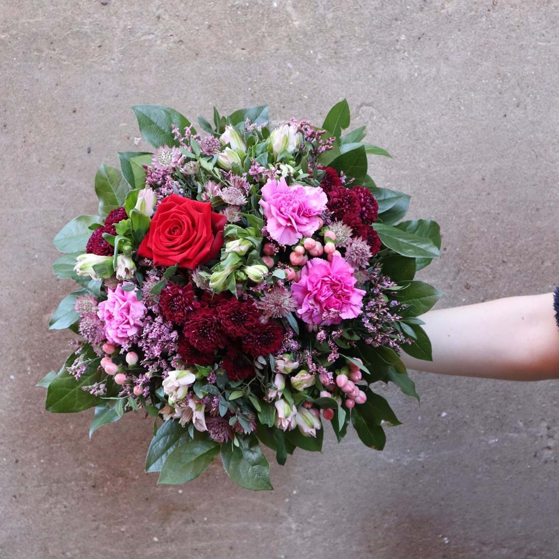 Årstidens Blomster binder efter sæsonens blomster. Det betyder at dekoratøren binder ud fra billedets stemning, former og størrelser. Der kan derfor forekomme andre alternativer til viste blomster på billedet. Dette giver et unikt udtryk til det færdige binderi.