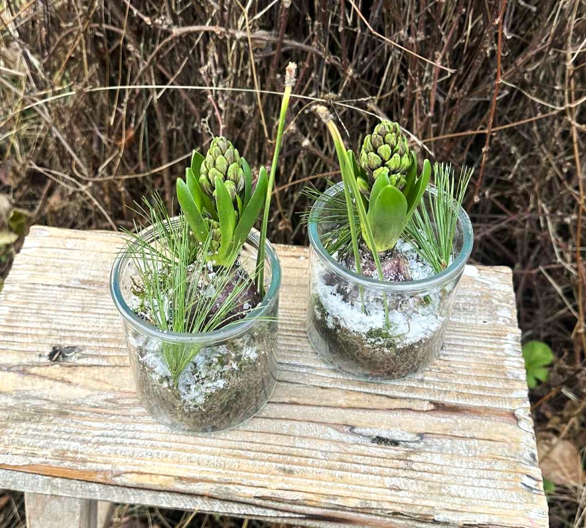 Hyacinter dekoreret i klare glas er en fin værtindegave, gode som bordpynt og som en lille hilsen. Prisen er for et glas med en hyacint i en overraskende farve, pynt og lidt sne. Fine enkeltvis eller flere sammen.