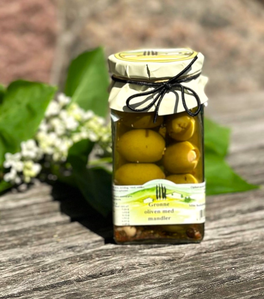 GRØNNE OLIVEN MED MANDLER | 250 GR. DRÆNET VÆGT