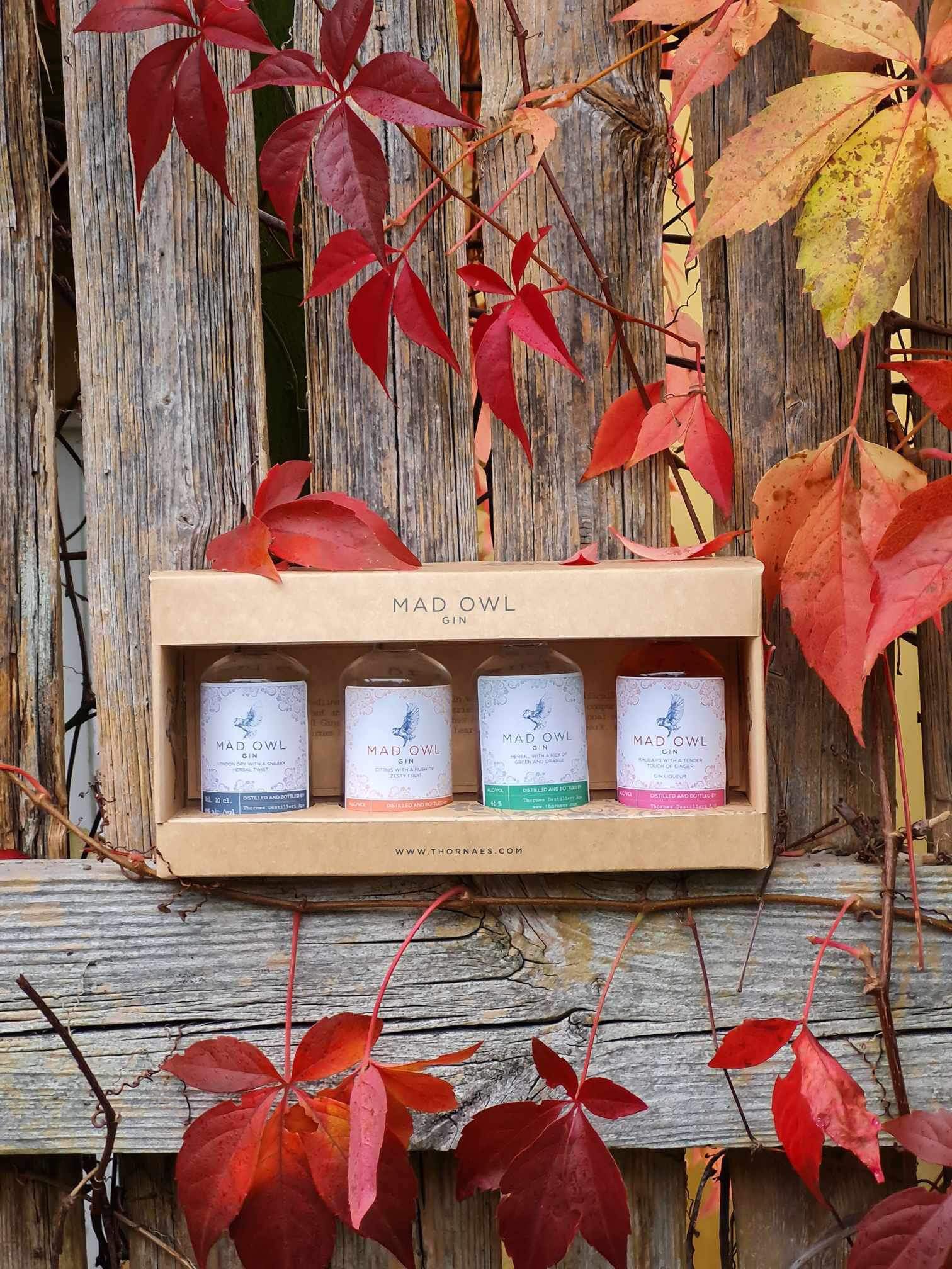 Mad Owl Gin - Smagsæske giver en fantastisk og kraftfuld smagsoplevelse. Æsken består af varieret udvalg fra Mad Owl Gin serien. En vidunderlig værtindegave eller måske endda som en pragtfuld adventsgave. Du kan selvfølgelig også bare nyde den selv.
